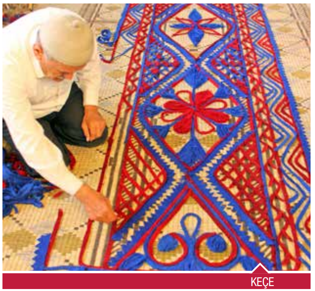 Keçe, doğal yünün dokunmadan yalnızca dövülmesiyle elde edilen kaba kumaştır. Hasırdan oluşan kalıp üzerine boyanmış şerit keçe parçaları ile “naaş/nakış” denilen motifler döşenir ve yünler “çırpı” ile motiflerin üzerine serilir.