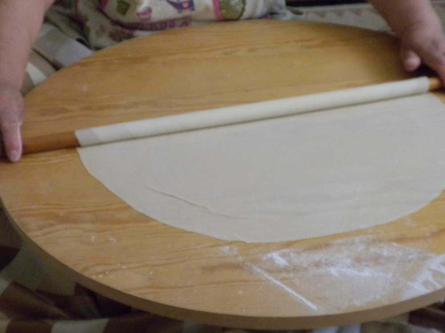 Süt, yağ, sirke, yumurta ve tuz çırpılıp, içerisine aldığı kadar un konularak kulak memesi yumuşaklığında hamur yoğrulur. Baklava yufkalarının daha iyi açılması için, hamuru akşamdan yoğrularak dinlendirilir. Hamurdan (yedi altına yedi üstüne döşenecek kadar) on dört adet küçük beze yapılarak, yumuşak kalması için oklava üzerinde biraz buruşturularak yağlanmış baklava sinisine döşenir. Üzerine önceden hazırlanmış kesmikler orantılı olarak, dizi halinde yerleştirilir. Kalan yedi bezeden açılan yufkalar da üzerine döşendikten sonra, kare şeklinde dilimlenir. Üzerine kepçeyle yağ dökülerek, önceden ısıtılmış fırında veya mahalle fırınında üzeri kızarıncaya kadar pişirilir.