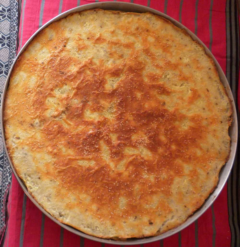 Yağlanmış tepsi üzerine, 6 yufka hazırlanan yumurtalı su ile birer birer ıslatılarak döşenir. Hazırlanan iç harcı üzerine yayılır. Kalan diğer 6 yufka da aynı şekilde ıslatılıp tepsiye döşenir. Börek, ocak üzerinde önce bir yüzü sonra çevrilerek diğer yüzü pişirilir. Diğer yüzüne çevrilirken tepsi tekrar yağlanmalıdır.